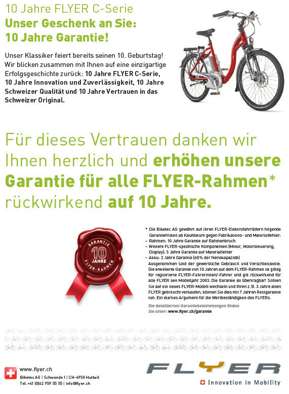 Die Firma Flyer verlängert die Garantie auf alle Rahmen von 5 auf 10 Jahre. Diese Änderung gilt auch rückwirkend ab dem Modelljahr 2003.